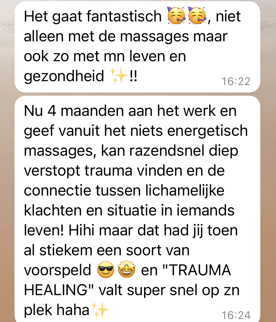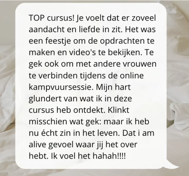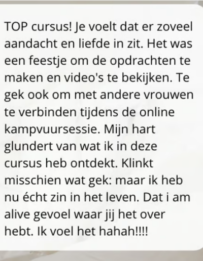 Nu ervaar ik veel vertrouwen. Dat is de basis om door te pakken, om je ruimte aan te nemen. Ik voel plezier en enthousiasme. Ik geniet van de reis en de creatiekracht die door me heen stroomt. Dit traject zet je in beweging!