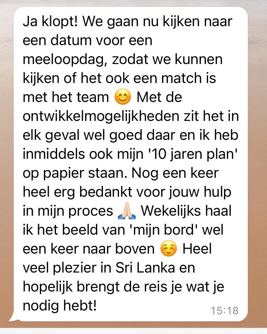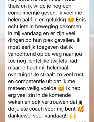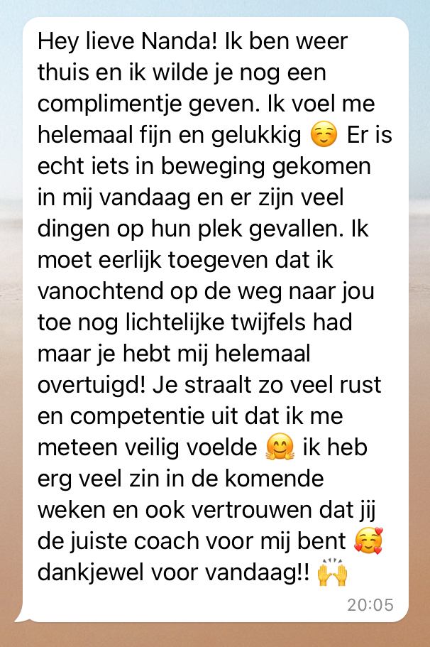 Ik had het zelf nog niet eerder meegemaakt dat een coach zo betrokken is. Als ik het vergelijk met ervaringen van vrienden heb ik geluk gehad met Nanda. Zij heeft geen one size fits all aanpak en ze is echt bereikbaar en betrokken. Waar sommige van mijn vrienden in het diepe werden gegooid met een vaag werkboek en bijna geen mogelijkheid tot vragen en feedback.